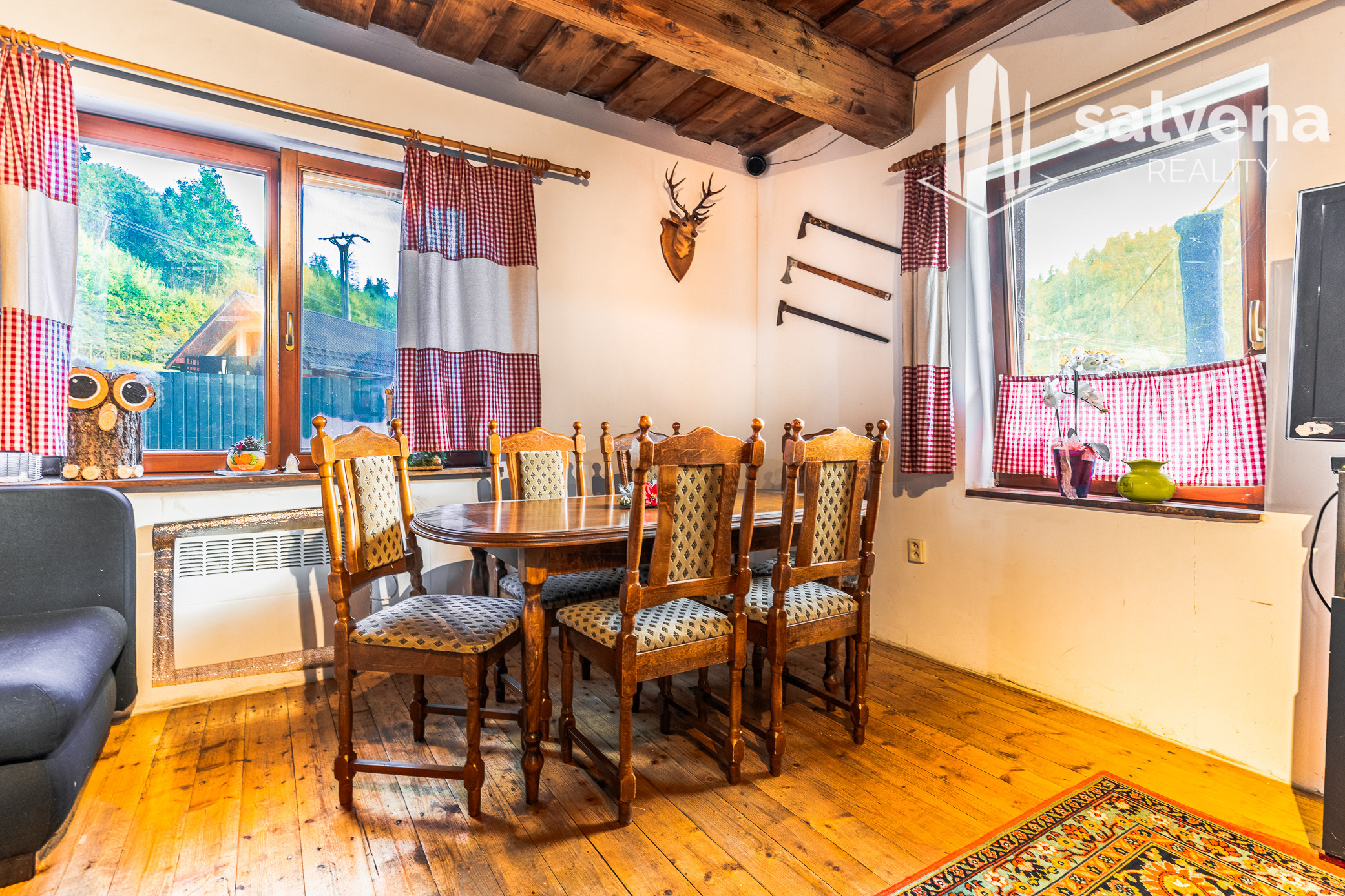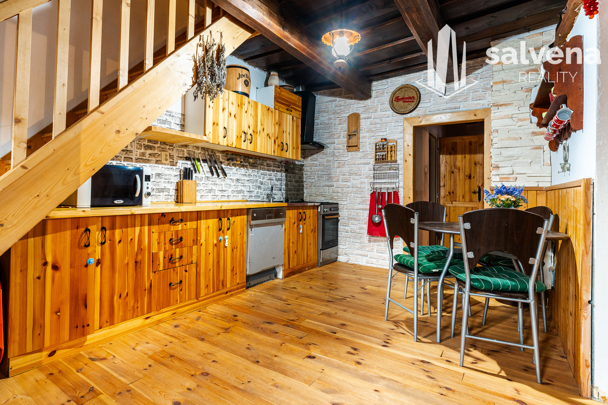 Dom je zapísaný na LV ako rodinný dom (možný hypotekárny úver), má 2 podlažia + suterén a dokopy až 16 lôžok. Interiér nesie poctivú drevenú atmosféru, jedáleň s veľkým stolom a kuchyňu plne vybavenú vrátane umývačky riadu – ideálne pre väčšiu partiu aj dlhší pobyt. Internet je samozrejmosťou.