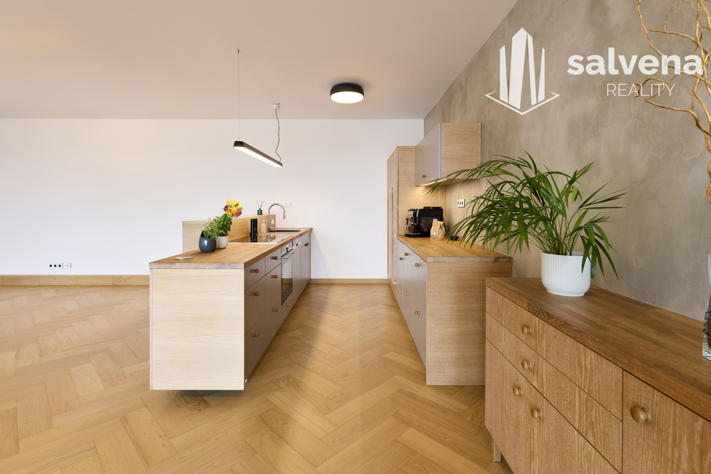 Obývacia miestnosť spojená s kuchyňou a ostrovom na mieru je srdce bytu. Dubová „rybia kosť“ dodá autoritu. Obrovské posuvné presklenie stiahnete jednou rukou, vyjdete na krytú terasu a mesto je vaše – za dažďa, za slnka, o piatej ráno aj po polnoci.