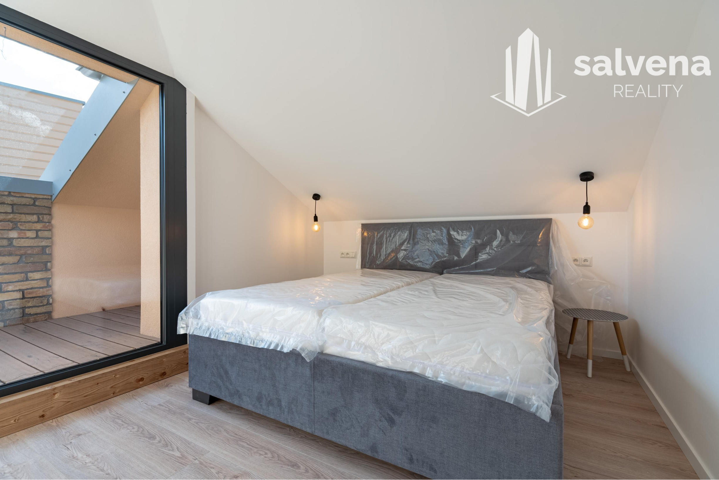 Spálňa ponúka manželskú posteľ s novými matracmi, dostatok priestoru na šatník a priamy vstup na terasu.