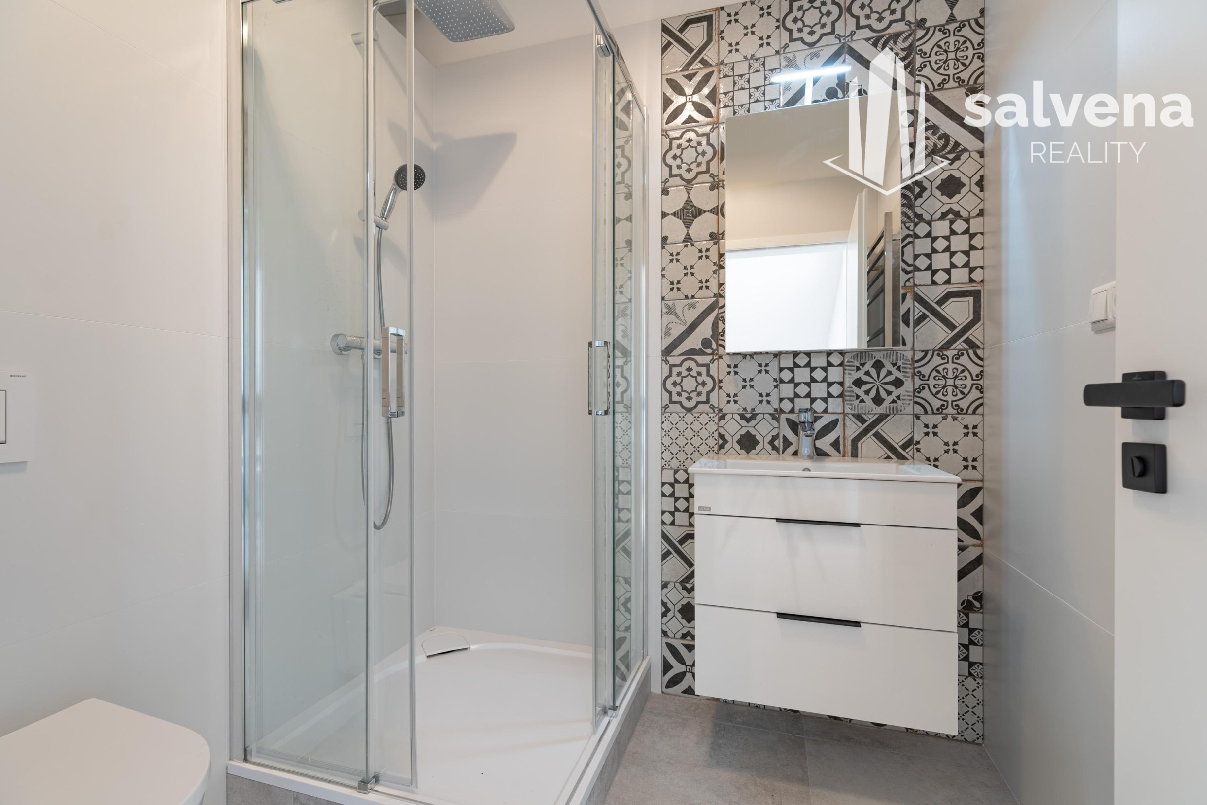 Kúpeľňa je vybavená moderným sprchovým kútom, veľkým zrkadlom, skrinkou pod umývadlom a obkladom s patchwork motívom, ktorý dodáva priestoru osobitosť.